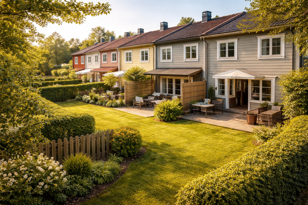 I många radhusområden ligger baksidan mot andra tomter.